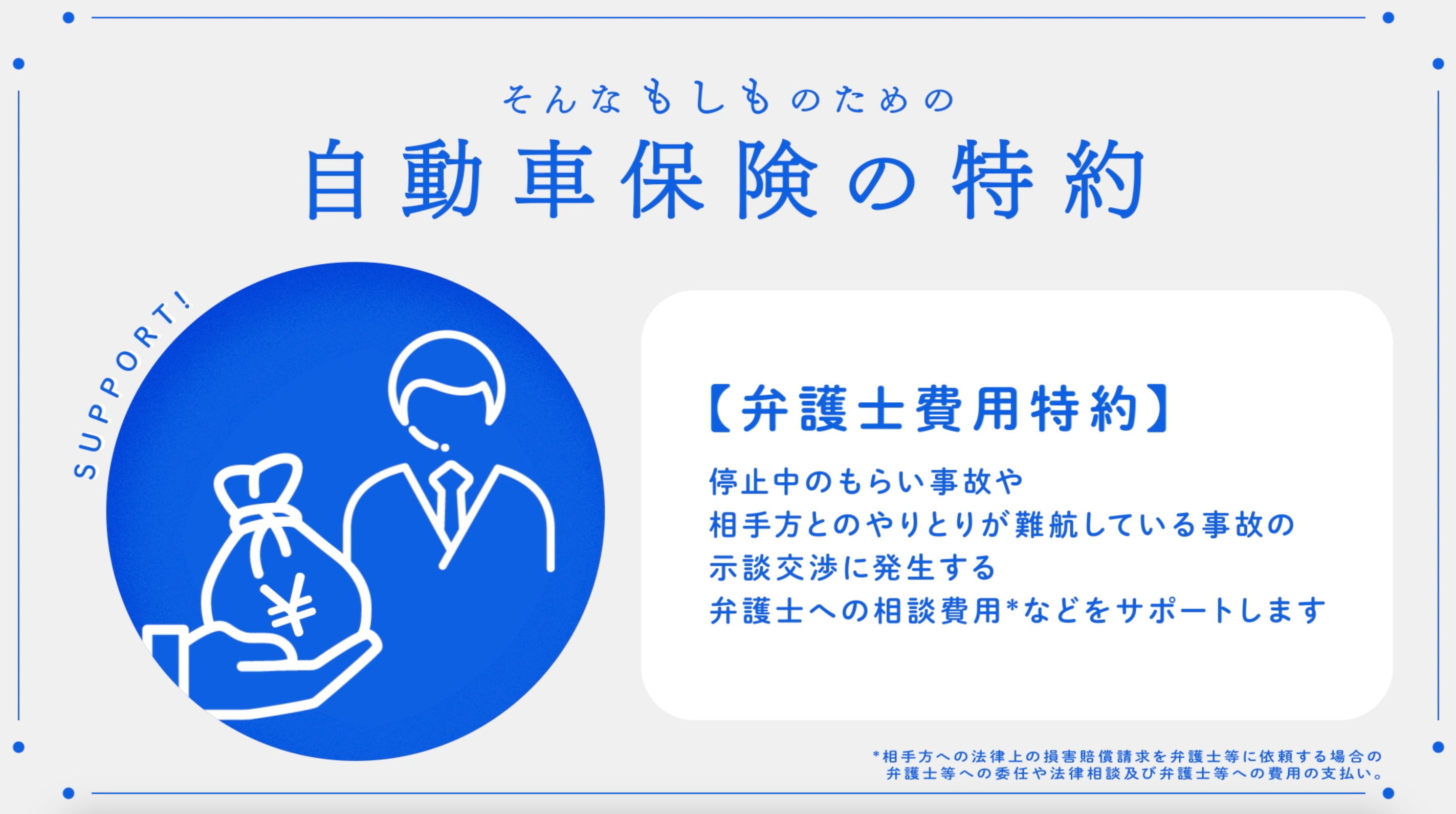 <p>自動車保険には様々な特約をオプションとして付けることを検討してみてはいかがでしょうか?</p>